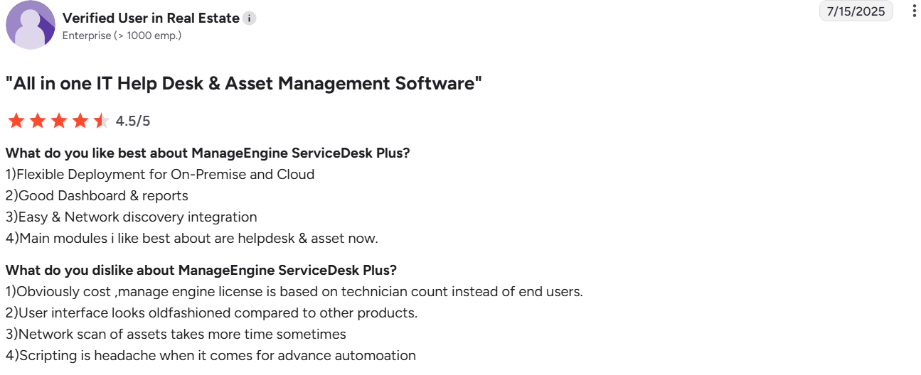 It delivers faster time-to-value, offering core ITSM and asset visibility on a cloud-based platform that is easier to deploy and manage than enterprise tools. However, asset and automation capabilities are lighter-weight and lack built-in support for advanced lifecycle operations.