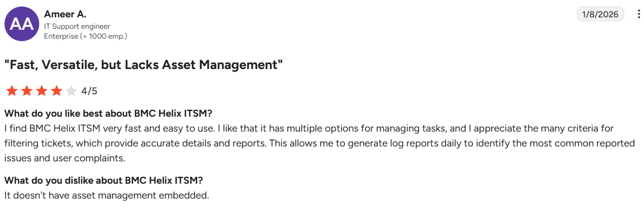 BMC Helix ITSM delivers AI-driven service operations and deep ITSM maturity, particularly in incident correlation, change risk analysis, and cross-team collaboration. However, its enterprise depth and configurability often translate into higher implementation effort and operational overhead.