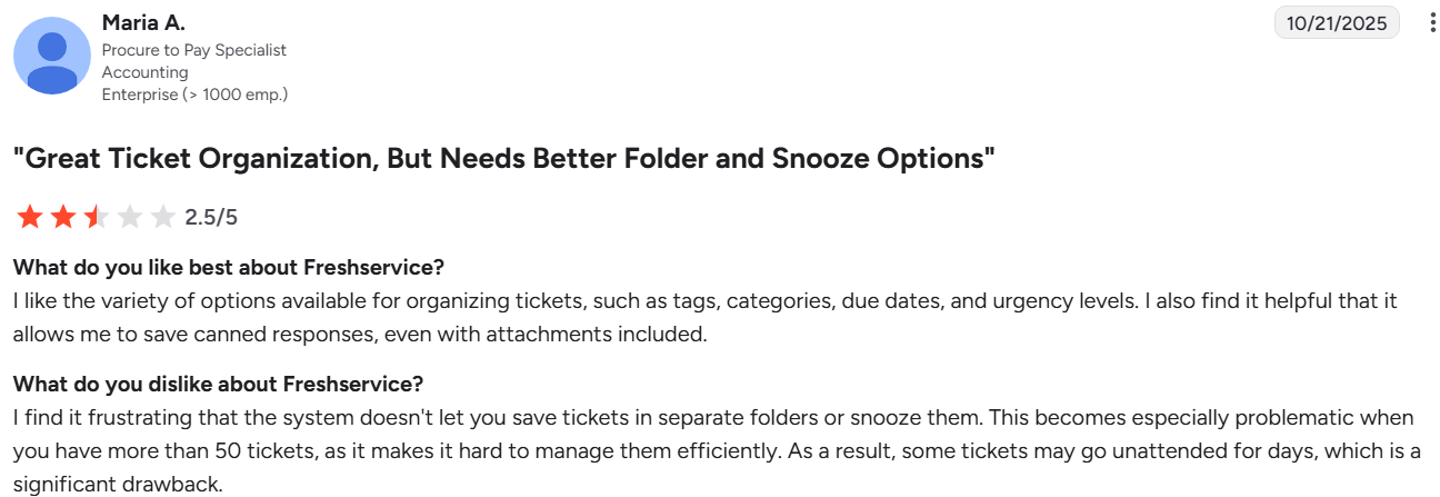 Provides flexible integrations and asset tracking linked to tickets, supporting mid-market ITSM needs. However, it has limitations in reporting depth and ticket modifications, affecting visibility as service operations mature.