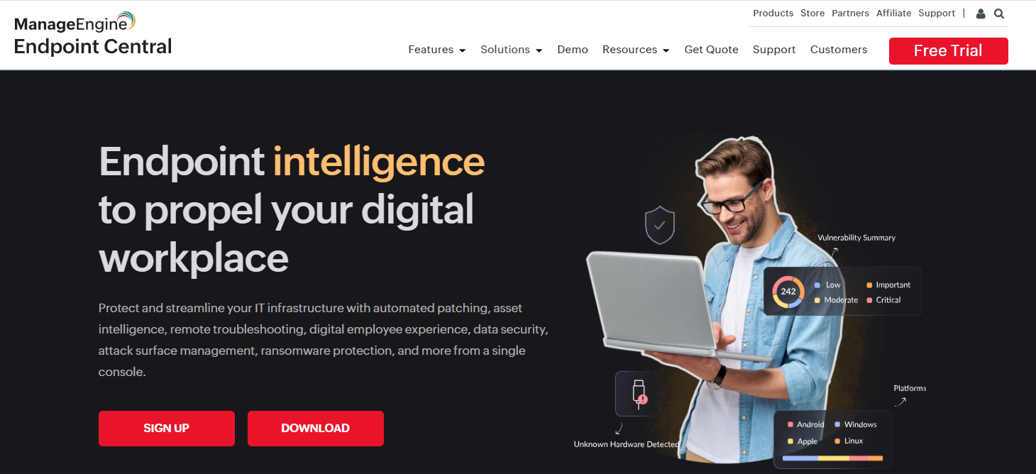 ManageEngine Endpoint Central is an all-in-one endpoint management and security platform. It brings devices, apps, users, and data into a single console. IT teams can automate patching, monitor digital employee experience, and enforce policies across Windows, macOS, Linux, iOS, Android, and ChromeOS.