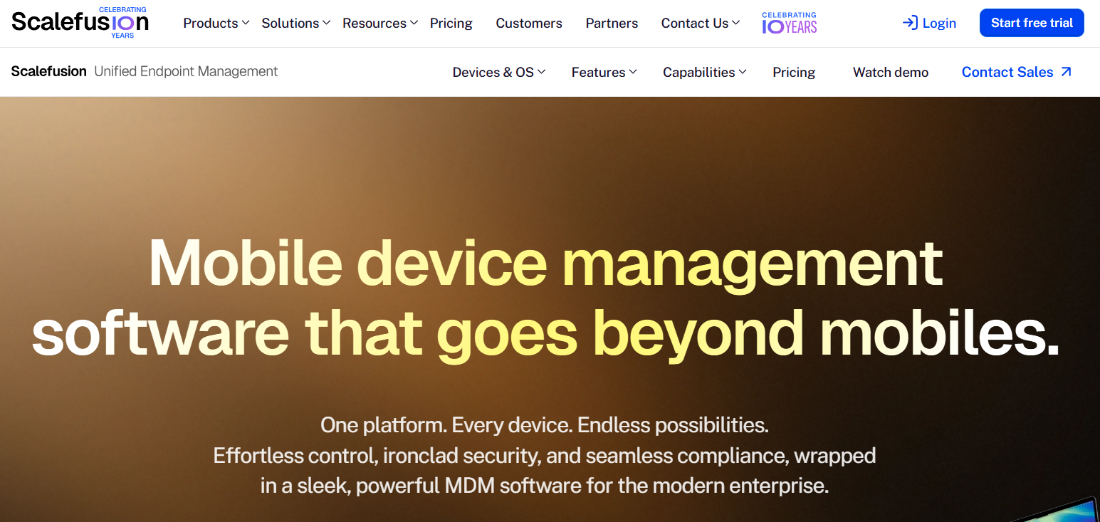 Scalefusion is a unified MDM solution that goes beyond mobile devices to cover laptops, desktops, tablets, rugged devices, and even IoT endpoints. The platform centralizes enrollment, policy enforcement, and application management while layering in advanced security, compliance monitoring, and content distribution.