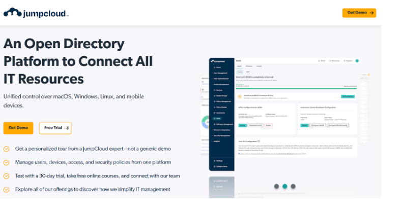 JumpCloud is a cloud directory and identity platform that also provides device management and software access control. Cloud-native teams commonly use it to centralize user identities, enforce security policies, and manage access to applications and devices without relying on traditional on-premise directories.